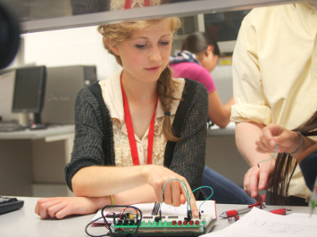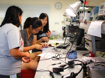 The photo on the left shows a CURIE Academy scholar demonstrating her two-input NAND gate assembled out of discrete transistors as part of lab 1. The photo on the right shows a group of three scholars working on their design project. This group implemented a smart grid system that automatically turned off lights in one part of the system when the power demand was too high in another part of the system and sent a text message to notify the power grid operator. For more information and photos see the CURIE Academy 2014 Design Project webpage.