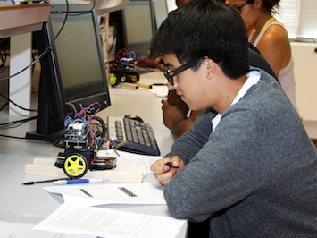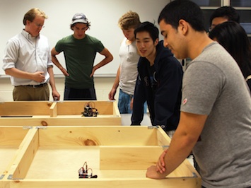 The photo on the left shows a lab group working on their mobile robot control application that will enable the Arduino-based robot to navigate a small playing field, avoid obstacles, and find a black square painted in one corner of the playing field. The photo on the right shows several lab groups testing their robots on the playing fields. The lab includes several incremental steps so that students can familiarize themselves with programming the Arduino, gathering input from various sensors (e.g., bump switches, light sensor), and moving the robot using two drive motors. The students were required to use a closed loop controller since the robot was initially placed in an unknown position on the playing field. For more information and photos see the ENGRG 1060 Computer Engineering Unit webpage.