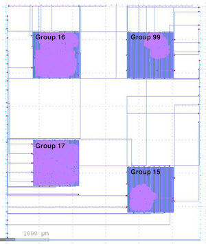 The chip floorplan on the left was the first teaching test chip for ECE 5745 taped out on SkyWater 130nm through the efabless ChipIgnite program. The chip included four projects with 15 students participating: a CRC32 checksum unit implemented using C++ high-level synthesis via Mentor CatapultC, a latency insensitive synthesizable memory implemented in PyMTL3, a 2x2 systolic array multiplier implemented in SystemVerilog, and a greatest common divisor unit implemented in SystemVerilog. Each unit included its own dedicated SPI interface for isolated testing.